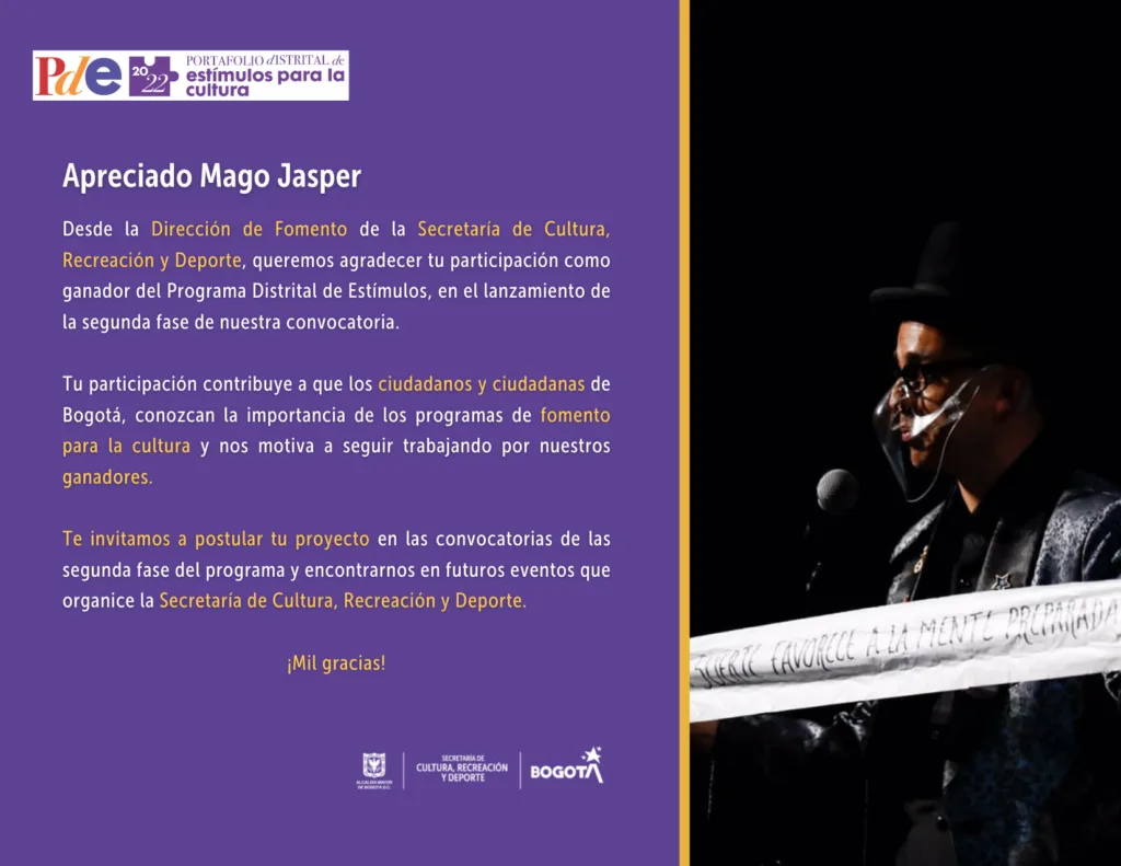 Contrato servicios artísticos, creativos y culturales, durante el lanzamiento de la segunda fase del programa distrital de estímulos 2022 a realizar el día 21 de abril de 2022 en la Cinemateca Distrital.